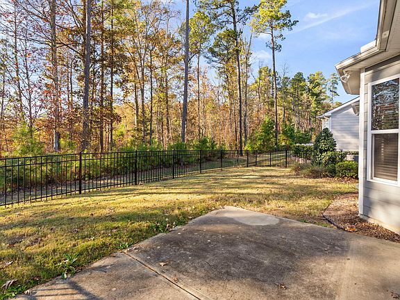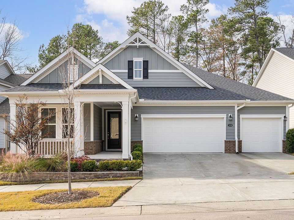 Stunning one level home w/ 3 car garage on a private wooded lot! Located in one of Raleigh Durham's top 55+ communities, this home offers upscale custom finishes throughout. Bright open kitchen with light finishes overlooks spacious great room detailed with custom bookshelves, gas fireplace and transom windows. The large dining area features bay window and views of the gardens and natural woods. Butler panty located just off kitchen for extra counter space and storage. Primary suite features trey ceiling, bay windows and luxury dual vanity bath. Custom walk-in closet designed for easy organization and room for everything. Guest suite with large closet and ensuite bath. Separate / flex room with French doors. Enjoy the screen porch with EZ Breeze windows overlooking the spectacular views of the natural woods. Generous laundry room w/ storage, owner's entry with granite counter space and add'l cabinets. You'll love the convenience and storage of the 3 car garage with epoxy floor. Tankless water heater offers endless hot water. Enjoy the 55+ lifestyle with clubhouse, heated pool, pickleball and tennis courts, dog park, fitness and year-round clubs, events and community connections. Located in the Brier Creek area with easy access to all parts of the Triangle region including the airport and RTP, shops, restaurants and outstanding healthcare!