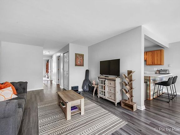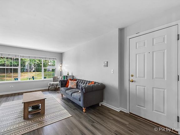 Highly desirable first-floor unit featuring 2 spacious bedrooms, 2 full bathrooms, and an attached garage. Recently updated with brand new paint, carpet, wood flooring throughout, new fixtures, and a new furnace, this home is truly move-in ready. The inviting kitchen offers abundant oak cabinetry, generous counter space, and a convenient breakfast bar. A bright dining area opens to a private patio through sliding glass doors, perfect for enjoying the outdoors. The layout flows from the living room and hallway into the laundry room and both bedrooms. The primary suite includes a walk-in closet and a private bath with a double-sink vanity and linen closet. The second full bathroom features a tub and an additional large linen closet. Enjoy a peaceful neighborhood setting near Long Lake, scenic ponds, and walking trails-all within walking distance to the Long Lake Metra station. Garage includes a keypad for convenience. Recent updates: brand new furnace, paint, carpet, wood flooring, bathroom remodel, and fixtures (2025), water heater (2015), and disposal (2017). Welcome home!