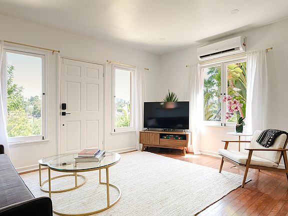 Prime Silver Lake Sanctuary. Location, location, location! Kick back and relax in this furnished tranquil, light-filled lower unit apartment of a triplex located in the heart of Silver Lake. Enjoy spectacular sunset meals outside on multiple secluded terraces boasting brand new stylish xeriscape. Or stroll down to Lamill, Botanica, L&E Oyster Bar on Silver Lake Blvd., or one of the many other walkable restaurants just down the road on Sunset Blvd. New designer furniture fills this large one bedroom 700 sqft apartment. Crisp and clean new finishes throughout. Enjoy downtown views from almost every window.