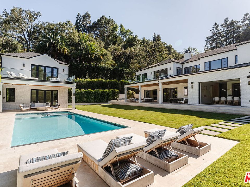 Poised behind gates on an expansive and secluded three-quarter-acre parcel, this newly completed Traditional estate is a triumph of scale, craftsmanship, and refined architectural vision. Set within one of Brentwood's most sought-after enclaves, the residence spans nearly 11,000 square feet of exquisitely tailored living space, comprising a grand main residence and a fully detached, two-story guest house -- each executed with an exacting standard of design and finish. A dramatic double-height foyer introduces interiors of quiet grandeur, where custom millwork, hand-selected natural stone, and a gallery-like flow elevate both form and function. The formal living room is anchored by a marble fireplace and sculptural wine bar, while the adjoining dining room opens entirely to the outdoors via a retractable glass wall, creating seamless flow to the estate's lush grounds. At the center of the home, a marble-clad chef's kitchen combines striking aesthetics with professional-grade performance, featuring Sub-Zero and Wolf appliances, an artisan coffee bar, and bespoke cabinetry. A sunlit breakfast area opens to a gracious family room, while a lounge and seated wet bar, dedicated office, guest suite, and two powder rooms complete the main level. An elevator and dual staircases ascend to the private quarters above, where five ensuite bedrooms are thoughtfully arranged, including an extraordinary primary retreat with soaring beamed ceilings and glass doors opening to a private terrace. Two couture-inspired dressing rooms and a spa-caliber bath, complete with a dual steam shower and sunlit soaking tub, offer a daily ritual of serenity. An upper-level screening room, wet bar, gym, and additional family room provide flexible spaces for recreation and relaxation. Outside, the resort-style grounds unfold with effortless sophistication: a sparkling pool and spa with Baja shelf and auto cover, a covered and heated entertaining pavilion, outdoor kitchen, firepit lounge, sport court, and vast emerald lawn, all surrounded by mature hedging that ensures privacy and tranquility. The two-story guest house offers unparalleled versatility, featuring a living room, kitchenette, powder room, and an upper-level bedroom suite with a private balcony, ideal for a pool house, accommodating extended stays, or a studio. Additional highlights include a fully integrated home automation system, dual laundry rooms, and a 3-car EV-ready garage accessed via a cobblestone motor court. More than a home this is a rare architectural statement, exquisitely composed and beautifully aligned with the timeless spirit of the Westside.