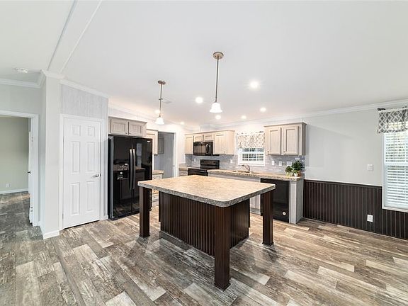 Beautiful 3/2 PLUS OFFICE and it's BRAND NEW! This 2024 manufactured home is located 10 mins from the World Equestrian Center, 15 mins to Rainbow Springs State Park and an easy commute to both Ocala and Dunnellon. Move-in ready home features a spacious split floor plan with 1404 sq ft of comfortable living space all on a 1/4 acre lot. Modern finishes include LUXURY vinyl flooring and CROWNN MOLDING throughout, beadboard walls in dining area, recessed lighting in kitchen with a functional island for seating and storage! The primary suite offers a glass enclosed TILE SHOWER w/ rainwater shower head, garden tub, dual sink vanity and walk-in closet. The two guest bedrooms have built in closets and are convenient to the shared bath w/ linen cabinet in the hall. The additional Office/Den could serve as a 4th bedroom if needed. Just off the kitchen is the laundry room with built in cabinets and back door entry. Home is on a corner lot with woods in back. Side entry driveway, well, septic, central AC...it's all there and ready to be used by you!