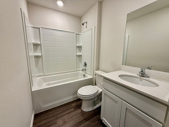 Welcome to this beautiful four-bedroom like new home located in the desirable Main Street Village. Step inside to find a stunning kitchen with quartz countertops, stainless steel appliances, and a walk-in pantry. Seperate dining area. The open layout flows seamlessly with luxury vinyl plank flooring throughout. The spacious primary suite offers a relaxing retreat with a large walk-in closet, dual quartz vanity, and a walk-in shower. Additional features include a programmable Wi-Fi thermostat, covered front porch, and rear patio perfect for entertaining. Washer, dryer, and refrigerator are included for convenience. A privacy-fenced backyard provides comfort and security, and wood faux blinds will be installed. Small pets are negotiable. Just minutes from shopping, schools, and parks, this home blends modern style with everyday convenience. Owner to manage with approved application..