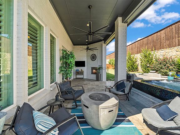 Outdoors, a resort-style pool with infinity-edge hot tub sets the stage for relaxation and entertaining. The covered patio extends the living space, making it ideal for gatherings year-round.