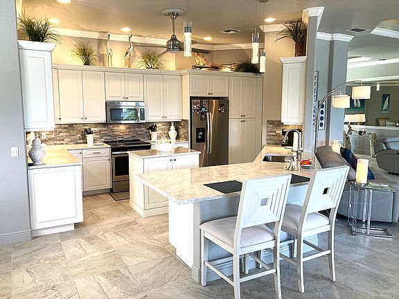 Travertine pool deckQuartz countertopsUpgraded plumbing fixturesOpen basin view canal