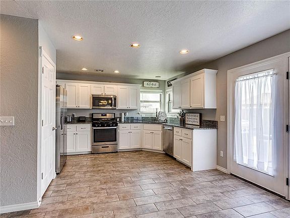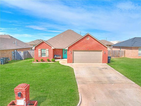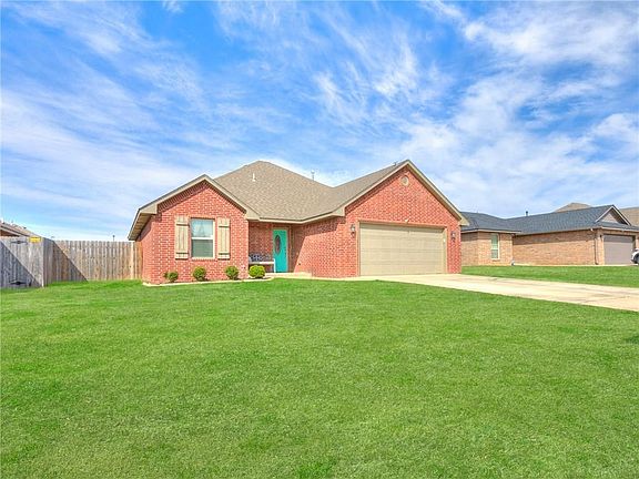 *MULTIPLE OFFERS RECEIVED* OFFERS DUE by 12pm Monday. IMMACULATE home conveniently located minutes from I-35 near restaurants, shopping, & 1 block from elementary school. Spacious open concept floor plan with custom blinds & wood look tile throughout, carpet in bedrooms. Kitchen has trendy shaker cabinets, granite counter tops, stainless steel appliances, pantry, & ample room for kitchen island. Tray ceiling in living area & primary bedroom with recess lighting & crown molding. Primary ensuite has dual vanities, tiled shower/garden tub combo with his & hers walk-in closets. Additional insulation between primary bedroom, guest bathroom & living area wall for extra sound barrier. Storm shelter & tornado resistant garage door with higher wind pressure rating. Foundation constructed w/deeper & wider piers than standard. Roof constructed with hurricane straps for Oklahoma high winds. Double insulation added around water tank for energy savings. HVAC serviced yearly. Splashpad 1 block away.