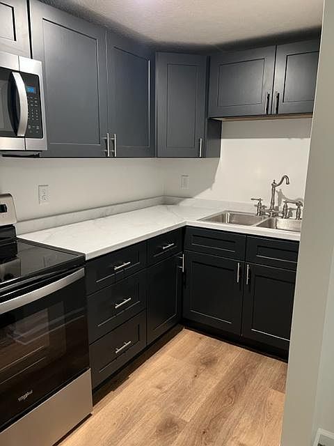 Completely updated! All new stainless steel appliances (frig, built-in microwave, oven), cupboards, countertops, light fixtures, plumbing fixtures, paint, carpet, & windows! This is a lower-level apartment.