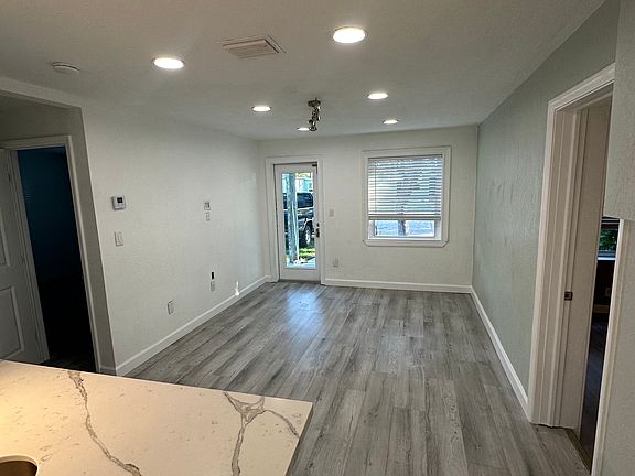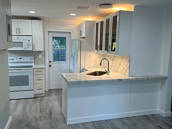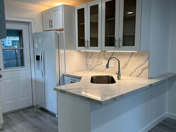 Step inside to find a bright, modern kitchen with sleek white cabinetry, marble-style countertops, and updated appliances. The laundry area is designed with both function and style, featuring overhead cabinets and natural light. The bathroom boasts a luxurious walk-in shower with stone detailing and elegant fixtures. Newer flooring throughout gives the home a fresh, contemporary feel.