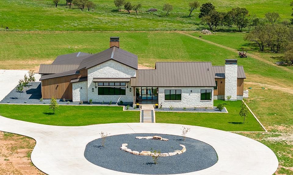 Rare Gem in Fredericksburg. Nestled just 1.5 miles from the vibrant heart of Main Street and outside the city limits, this extraordinary property offers a unique blend of luxury and ranch-style living, with no HOA restrictions, short-term rentals allowed, and additional structures permitted. 4854 SF, set on 3.54 ag-exempt acres, this home boasts serene views of a neighboring cattle farm and is perfectly positioned to enjoy the Southeast breeze from a spacious 24 x 30 motorized screened patio. Thoughtfully designed to complement its lot, this home showcases nearly every luxury you could imagine. Step into a grand double entry foyer leading to an open, light-filled space with features that include 10" French oak flooring, floor to ceiling limestone walls and 200 year old hand-hewn beams. A chef's dream kitchen with limestone floors, cabinet-panel Bosch appliances, double dishwashers, an Italian stove range, honed quartzite countertops - backsplash, toe kick and under-counter lighting, alongside a stylish wine bar for all your Fredericksburg favorites. Wood and stone accents, a butler's pantry, designer-tiled bathrooms, and versatile rooms.