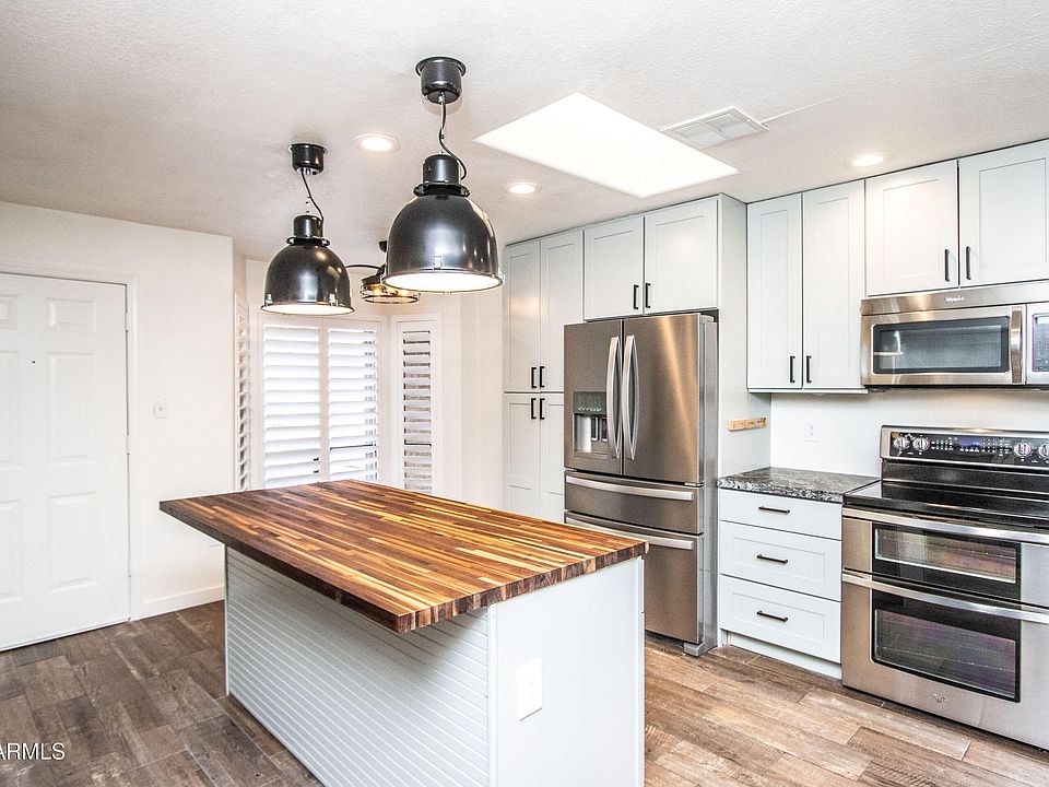 Updated modern kitchen w/beautiful butcher block island, industrial pendant lights, eat-in dining room & breakfast bar peninsula. Light grey modern cabinets, double oven, farm sink & stainless appliances. Guest bedroom separate from primary w/full guest bath. Large living room with wood burning fireplace, custom wall paint and wood look floors. Primary bedroom opens to private patio. Offers walk-in closet & full bath. 2 car garage and inside laundry. Community offers 2 pools, beautiful tennis courts, gated in the PERFECT location near shopping, Singh Farms, multi-use trails, 2 miles to ASU, easy freeway access, and minutes from Old Town Scottsdale.
