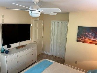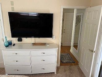 Adjacent to the front room is the private bedroom that features a queen size bed, large flat screen TV with Roku, YouTubeTV and ample storage in a large dresser, two nightstands and closet with shelves and hanging space. The bedroom is nicely appointed with high-end bedding, furniture, and digital clock radio.