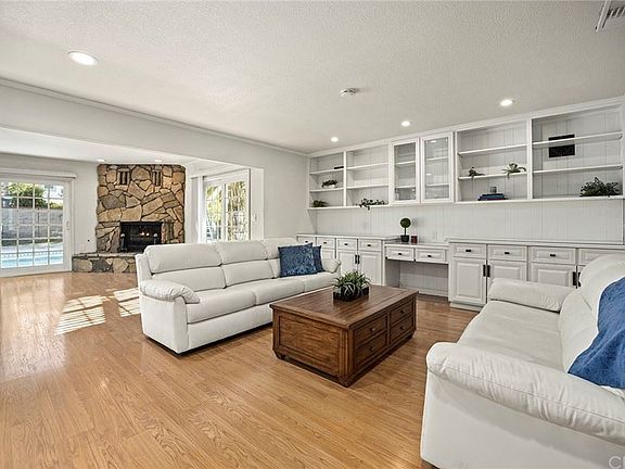 Gorgeous traditional Tustin home with incredible central location on a cul de sac street! Timeless curb appeal with board and batten siding, brick accents and double door entry. Enter into the free-flowing open plan with large light and bright living room, vaulted ceilings and warming fireplace. The large kitchen that can accommodate center island has been updated with white raised panel cabinets, black granite backsplash and tops, stainless appliances, chair rails and crown and most importantly open to the generous family and game room with bar and fireplace. The large and bright downstairs bedroom can accommodate a king size bed and has access to the completely remodeled downstairs bath done in a carrara marble look with new shaker vanity and zero curb walk in shower. The downstairs is complete with inside laundry and direct access to the large 3 car garage. Upstairs has 3 generous size bedrooms including huge owner's suite with walk out deck, wall of closets and gorgeous updated dual bathroom vanity. Entertainer's yard right off the game room with diving pool, spa, water slide, covered patio and plenty of space for sun soaking and grilling for family and friends. The location is ideal with close proximity to Tustin Ranch Golf Course, abundant dining and shopping options with Tustin Market Place and the District and attends Beckman High School. This home has been loved by the same family for 47 years and now ready for yours!