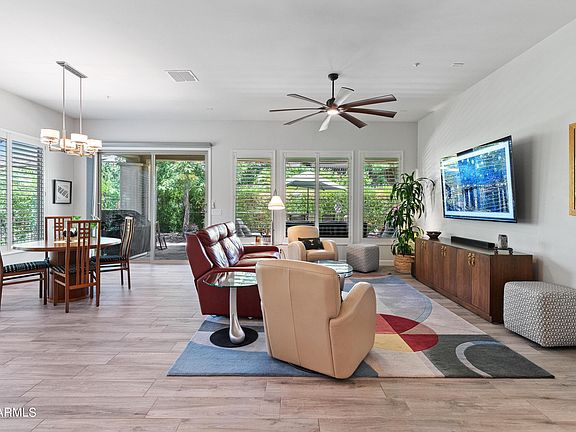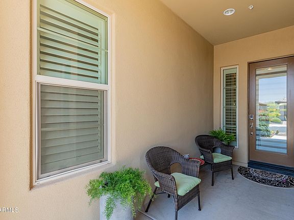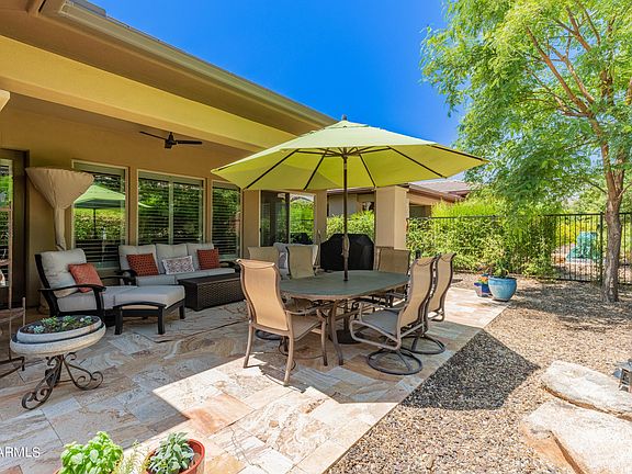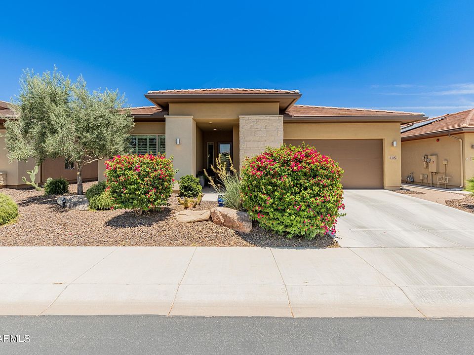 Highly updated Chroma Model, built in 2015 with Pre-paid solar for low utilities. This open floor plan includes 2bed/2.5 bath, office, den and smart space. Every square foot of this home is filled with upgrades, from the plank tile to plantation shutters and crown molding. The gourmet kitchen has custom quartz counter-tops with custom glass tiled backsplash, stainless steel appliances/range hood, high end cabinets with pull-outs. Guest room has barn door for privacy, bathrooms upgraded with custom tile, stone counter tops and framed mirrors. The private and peaceful backyard is fully fenced with a travertine patio and power shade. Garage has epoxy floors, built in cabinets and hanging rack storage. Don't miss out on this amazing home.