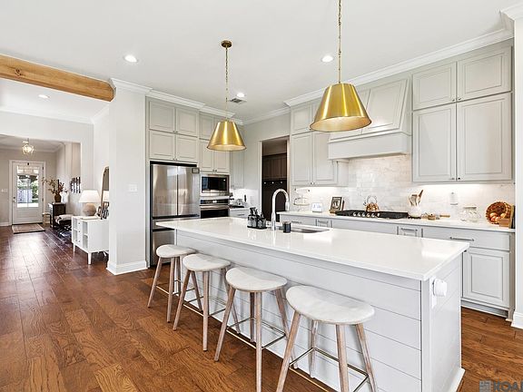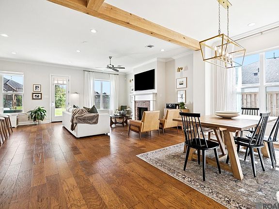 Easy living on Elissa. Located in the highly desirable Village at Magnolia Square, this one is sure to stop your scrolling. Incredible curb appeal that you'll love pulling up to and hate leaving everyday. Fresh landscaping and a front porch ideal for sitting and swinging on. Walking in, the foyer immediately allows you to feel the warmth of home. You've got an open concept living, dining, and kitchen with natural light pouring in from every angle and antique wood beams to subtly section each designated space. Your living room has a brick surround fireplace, recessed lighting, and beautiful wood flooring that flows through the entire house. Your kitchen has a large island, quartz counters, stainless appliances, and ample cabinet/counter space. A split floor plan has your spacious primary bedroom being tucked in the back for seclusion. It leads to your primary bath which has double vanities, a large soaking tub, separate tiled shower, and a huge walk in closet. There's another bedroom near the primary that has its own en suite bath and the other bedrooms being on the other side of the house with ample size and storage. Out the backdoor is the perfect patio for grilling or relaxing which overlooks a green space big enough to feel some elbow room but not too much to lose that low maintenance lifestyle. Magnolia Square is a thriving and growing community with a community pool, playgrounds, and fishing dock, with retail in the front of the neighborhood which includes Stabs to make those date nights more convenient. Ready to see for yourself?