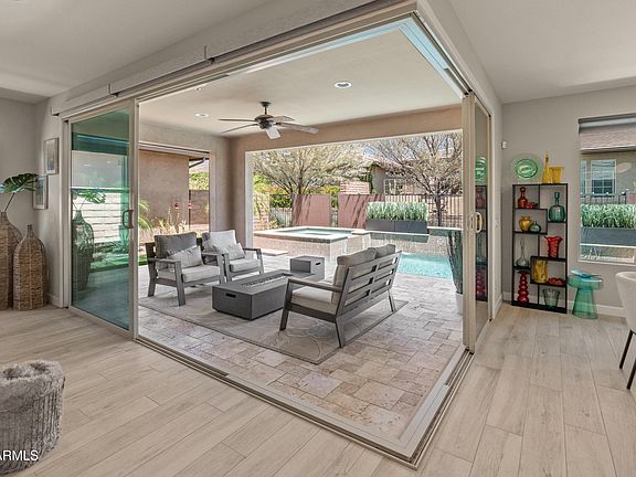 Stunning Trilogy Resolution Model with Resort-Style Backyard will delight! Welcome to this exceptional home, where elegance meets modern living. An upgraded paver walkway and glass-paned front door create an appealing entrance to this open floor plan home designed for comfort and style. The gourmet kitchen features a granite island with bar seating, a 5-burner gas stove, and upgraded cabinetry. Seamlessly connecting the indoors to the backyard, the three-panel corner sliders are a rare premium feature that expands the home's living space. The resort-style backyard includes a covered travertine patio, solar-heated pool with color-changing lights and water feature, and a gas-heated spa, perfect for relaxation or entertaining. A split-bedroom layout ensures privacy while maximizing functionality. Home is in the lock and leave section which includes front landscaping. Furniture available outside of escrow. This beautiful home is located in the active adult community of Trilogy at Vistancia, where residents enjoy 5-Star amenities, including two clubhouses, pickleball, tennis, bocce ball, fitness centers, swimming, and golf.