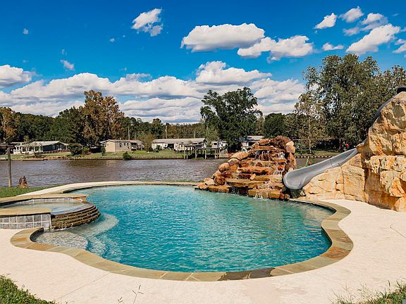 Custom inground poolFresh landscapingSeparate walk-in showerBoat slipsRock-wall waterfallHot tubGrand front elevation