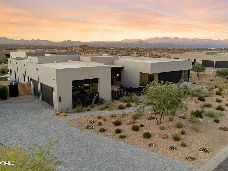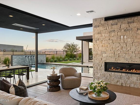 Introducing a coveted Shea Signature residence, the highest expression of design and craftsmanship from Shea Homes, set within Scottsdale's exclusive Storyrock community. Here, modern architecture meets the Sonoran Desert in a Dark Sky setting, where preserved starlight and protected landscapes create a rare sense of serenity—while still being just 15 minutes from Loop 101 and minutes from Scottsdale's premier shopping, dining, and schools. Walls of glass, spanning 12 and 20 feet, open the interiors to views of Tom's Thumb, Four Peaks, and the surrounding preserve. At the center of the home, the kitchen serves as both showpiece and gathering place, finished with a double waterfall quartzite island, Thermador appliances, and custom cabinetry. A fully appointed prep kitchen with JennAir refrigeration, Thermador dishwasher, and designer wallpaper accents complements the main space, while a butler's pantry adds refinement to everyday function. The primary wing is thoughtfully designed, with a private suite that frames mountain views directly from the bedleft unshaded to honor the Dark Sky settingand paired with a spa-inspired bath finished in full-height tile, dual vanities, and a soaking tub. Two junior suites and a full mother-in-law retreat with its own sitting room provide comfort and flexibility for family and guests alike. Nearly $50,000 in custom designer paintwork sets the backdrop for interiors that also feature a glass-enclosed media room and a collection of modern living spaces. Outdoors, the residence is designed for leisure and entertaining, with a resort-style pool featuring a baja step and water feature, integrated infrared patio heaters, a bocce ball court, and layered landscaping. Additional highlights include three HVAC systems plus a garage mini-split, epoxy-coated floors, Ring smart technology with keypad entry, and a laundry room finished with a full-height tile backsplash and dual GE washer/dryer sets. The home also offers walkable access to Tom's Thumb trailhead, golf-cart access to the Four Seasons and neighborhood dining, and a playground just outside the gates. Storyrock combines more than 150 miles of preserve trails with the convenience of Scottsdale living.