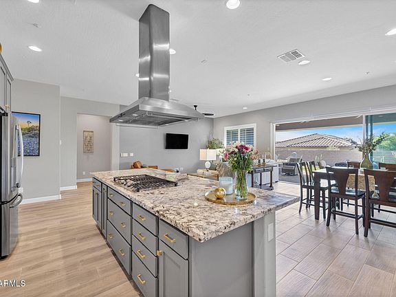 Welcome to your dream retreat in Trilogy at Vistancia, Peoria, AZ. This rarely available three-bedroom Montage Model spans 2,384 sq ft and includes upgrades galore that rival a model home. Inside, wood-look tile flooring runs throughout, complemented by plantation shutters. The spacious great room opens through an extended sliding door to the patio, complete with electric blinds for convenience and comfort. The gourmet kitchen features a gas stove, stainless appliances, custom cabinetry, and drawers beneath the stove for added storage and organization. A flexible bonus area offers space for an office, hobby room, or extended living space. Two private primary suites with custom-tiled showers provide comfort and privacy, while a third bedroom and bathroom add versatility. The backyard is ready for entertaining with an extended patio, built-in BBQ, and TV hookup. Ceiling fans, extended pavers, and a large fire pit create the perfect setting for enjoying Arizona evenings year-round.