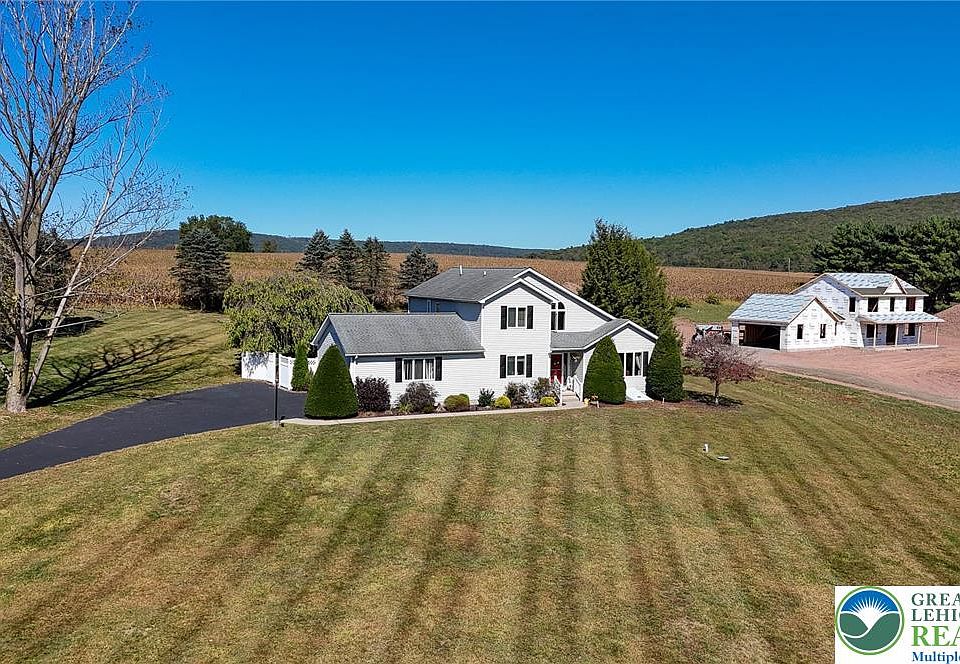 Showings begin on 10/12! Perched atop a hill, offering stunning views, this 2600sf custom contemporary home perfectly blends clean modern lines with wooded hills and valleys all round. A tiled foyer connects all areas of the main level and flows effortlessly into the living room, its cathedral ceilings soar and its large windows each become a work of pastoral art with picturesque surroundings. The formal dining room is accessed via two sets of pocket doors and leads into a welcoming kitchen boasting abundant storage with a lovely breakfast area overlooking the rear patio from its French Doors. A home office, or potential fourth bed, and spacious half bath with main-level laundry are situated privately to the side. The grand staircase is an exciting feature of this home, with a landing balcony overlooking the living room and, at the top, a sitting room with arched window making for another work of nature’s art. Three beds on this level include a primary suite with vaulted ceilings, walk-in closet and ensuite. A full bath completes this upper level. The basement is a sprawling blank canvas housing geothermal heat and utilities with space for whatever else your imagination can conjure! The built-in two car garage and paved driveway offer ample auto storage. Another gem of this home is the private rear patio with gazebo and pergola, offering multiple outdoor living rooms! Whether entertaining or finding cozy times in your hilltop retreat, this home offers something for everyone!