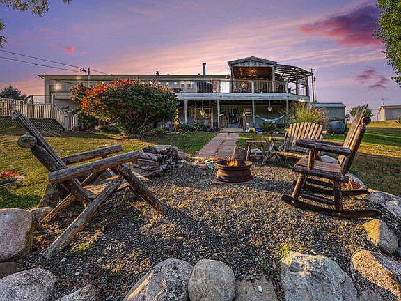Mature treesMultiple living spacesCovered deckCozy wood burning fireplaceFirepit gathering spotWide-open views