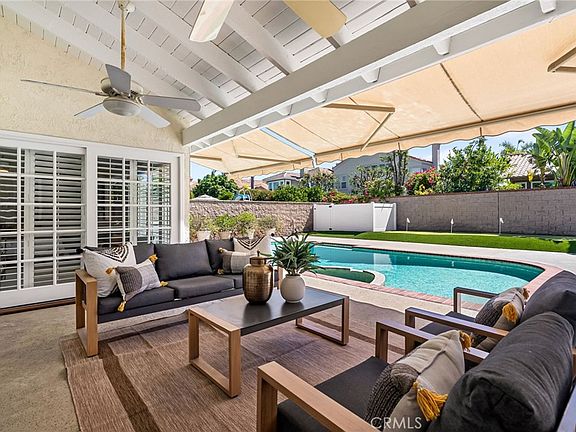 Highly desirable East Tustin location, tucked away on a quiet cul-de-sac bordering Tustin Ranch. This beautifully updated single-story home combines comfort, style, and convenience—just minutes from The Tustin Marketplace, major freeways, toll roads, and award-winning Tustin schools. Inside, a light-filled open floor plan showcases fresh paint, new plush carpet, plantation shutters and soaring ceilings that enhance the sense of space. The inviting living room with a cozy fireplace flows seamlessly into the dining room, creating the perfect setting for gatherings. Designed for both comfort and style, the bright kitchen and casual dining nook open to the inviting family room, where expansive windows with classic plantation shutters and motorized coverings frame serene views of your private backyard. Step outside to enjoy a generous covered patio, sparkling pool and spa, and a putting green designed for relaxation and fun. Vaulted ceilings in the main living spaces and a versatile den off the entry that doubles as a home office or optional fourth bedroom add flexibility. The primary suite offers a spacious retreat with an airy bathroom and private access to the backyard. The flexible layout creates a seamless connection between the inviting interiors and the backyard retreat. This Tustin home offers the perfect setting for entertaining both inside and out. Welcome home!