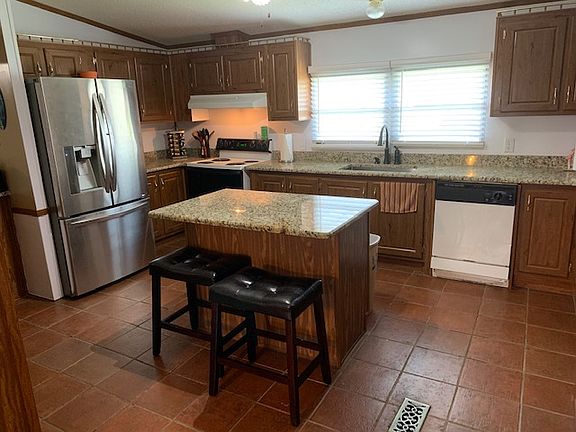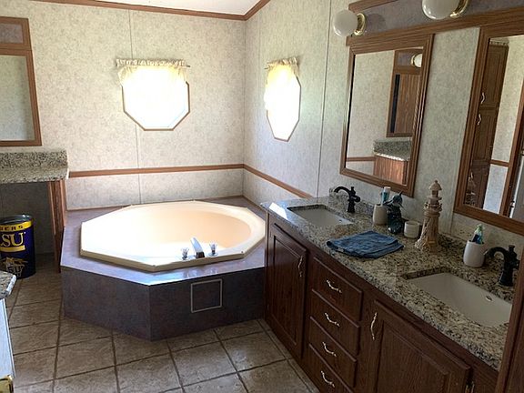 This three bedroom, two bath mobile home sits on a spacious one acre lot. The master bath has dual vanities with a separate shower and a large garden tub. Kitchen has plenty of storage space with an abundance of cabinets. The counter tops in the kitchen and bathrooms have been upgraded to granite. Laminate wood flooring has been installed throughout most of the home as well as tile in the kitchen and bathrooms. Master bedroom has a nice walk in closet. The front covered porch offers a nice place to sit outside. There is a carport for parking and two sheds that will remain