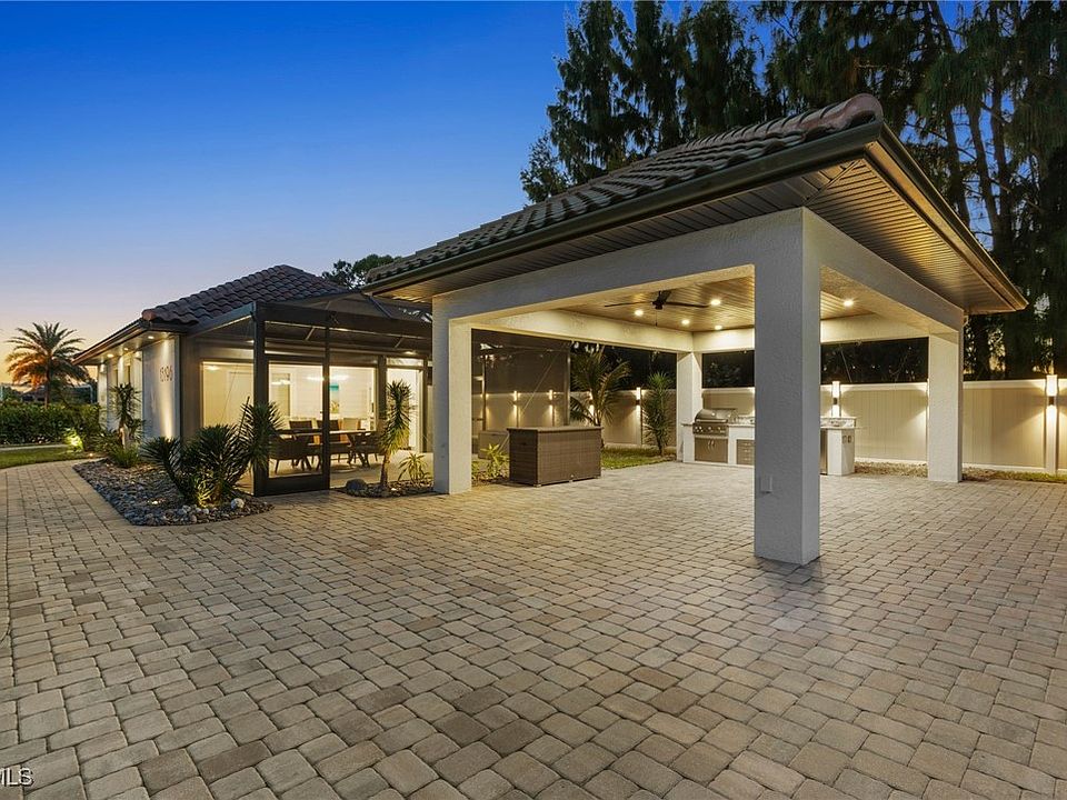 Wow! WOW! This property has it ALL!! Class A and Super C owners crave the space that this Super Sized (70' X 110') property provides. This is perfect for those who have a Stacker Trailer (painted to match their coach) or extra toys. The covered outdoor kitchen with pristine/unused outdoor grill, wood ceiling, and electrical hook ups for all your TV's/Electronics is perfect for entertaining or relaxing. When you step into the Coach Cabana you will first notice how Light and Bright the space is. The Eisen Glass and Storm Smart Screens with a specialty door provides a beautiful aesthetic and protection from the elements. The Marine Grade Cabinetry is a fabulous upgrade for the indoor/outdoor lifestyle we all enjoy here in SWFL. The well-appointed coach cabana does come partially furnished, with a screened area, and even an outdoor shower. There are two gorgeous pull-out couches, barstools, and fabulous lighting throughout. The walk in bathroom shower and linen closet provide all the modern conveniences of a luxury home. The extra large garage space is a perfect size for rack storage, golf cart, and has a back laundry area with cabinets and sink. Being located within Golden Palms Luxury Motorcoach Resort will allow you access to activities and amenities for everyone including a heated pool, spa, sauna, exercise room, pickleball courts, a 1-acre dog park for your furry friends, & a 22-acre lake for catch and release fishing. You will be surrounded by nature but only a short drive to restaurants, shopping, golf courses, airports, & Gulf beaches. Take your tour of this stunning property today!!