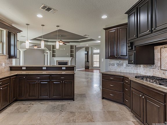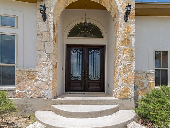 Single story luxury home with high-end finishes, situated on a 1.1-acre cul-de-sac lot in the Floresville community! A fabulous stucco & stone elevation with double front doors opens to reveal this light & bright floorplan with fresh neutral paint, travertine tile floors, ornate trayed ceilings, and tons of windows throughout the formal dining, living area with wet bar, family room with cast stone fireplace, sunlit breakfast room, and fabulous kitchen with granite counters, a tumbled stone backsplash, espresso cabinetry, and stainless appliances with a pot filler. The split floorplan boasts an oversized master with private patio access, a whirlpool tub, walk-thru shower, & dual vanities & closets. In addition, find a secondary master suite with private bath, another bedroom, and a study that could also serve as a bedroom. Relax beneath the covered patio with outdoor kitchen & peaceful views of the dense woods beyond, or enjoy the neighborhood pond, park, & easy access to San Antonio!