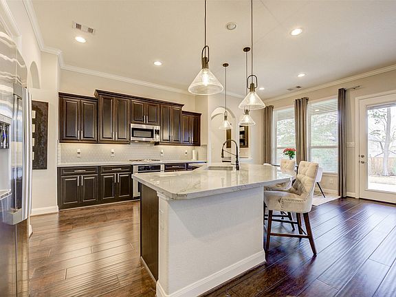 Gorgeous one-story located in the master planned community of Woodforest! Enjoy all nearby conveniences including coffee shops, restaurants, pools, parks, walking trails, tennis, basketball, clubhouse, & more! Well maintained with recent upgrades throughout. Rich hardwood floors and neutral paint welcome you. Gourmet kitchen is open to living room and breakfast nook. New pendants plus under cabinet lighting highlight new quartzite countertops. All stainless appliances included! Living room equipped with gas fireplace for chilly nights. Textured feature wall and upgraded fan add a modern touch. Plenty of natural light flows from the back of the home and beautiful draperies included. Nice sized primary bedroom plus en suite bath and walk-in closet. 3 additional bedrooms with full bath plus powder room. Additional flex space to use for formal dining or open office. Outside to your backyard paradise with generous sized covered patio and extended concrete to easily entertain. WELCOME HOME!