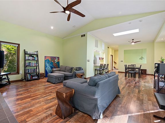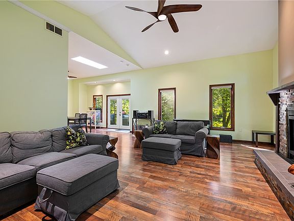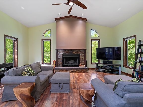 The main level features an open-concept living, dining, and kitchen area measuring 23x38, highlighted by a dramatic 12-foot vaulted ceiling, five skylights, and expansive windows that frame serene views of the surrounding woods. The updated kitchen showcases quartz countertops and seamless flow for both everyday living and entertaining plus a convenient half bath. The lower level has 3 bedrooms (including an enormous primary), a bonus room and 2 full baths. The deep garage fits 2 cars plus room for storage.