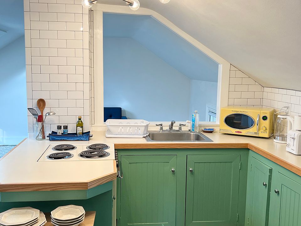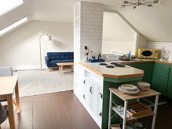 Monthly, furnished 1 bedroom apartment walking distance to the bay and downtown Belfast. Bright and airy, with new furnishings, the space is perfect for one person or a couple. Apartment is connected to our house, located on the second floor with a separate entrance. Spacious backyard and convenient to the local attractions and amenities.