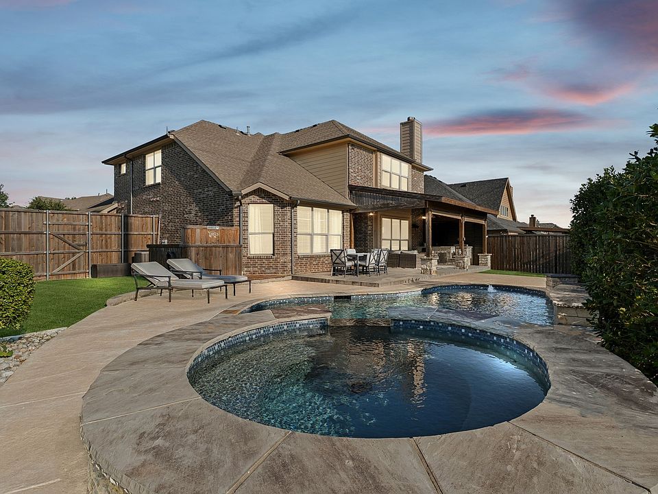 Sparkling poolUpstairs balconyOutdoor kitchenBackyard oasisRelaxing hot tubQuartz countertopsSoothing water feature