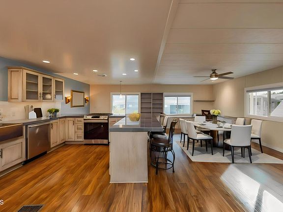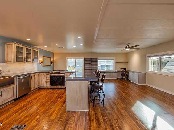 Welcome to an impeccably maintained mobile home showcasing an array of meticulously executed property upgrades. This turn-key residence, situated in a gated park, further presents upgraded bathrooms, upgraded windows throughout with light-filtering cellular shades, covered parking area for two vehicles, and direct access to the center of the park's walking path. The electrical system has undergone a comprehensive upgrade, including a modern electrical panel boasting 100-amp service, while the plumbing has been entirely revitalized with new copper pipes. Elevate your lifestyle with this meticulously upgraded mobile home that seamlessly blends modern luxury with functionality. Indulge in the comfort of a walk-in closet in the primary bath and an additional closet in the primary bedroom. Revel in the luxurious ambiance created by the seamless flow of engineered wood flooring throughout the entire residence. The kitchen, designed for culinary excellence, boasts an open layout adorned with recessed and pendant lighting, a distinguished copper sink, Porcelain countertops, and an artful marble backsplash. Modernity meets functionality with newer stainless-steel range, a breakfast bar, custom kitchen cabinets, soft-close built-in cabinets, and a built-in desk in the living area.Step outside to thelarge front porch with roll down shades or relax in the sitting area off thecarport with peekaboo mountain views, surrounded by low-maintenance artificialgrass and complemented by a retractable privacy shade. A vinyl fence along theback of the unit offers seclusion, and an oversized storage shed discreetlyenhances practicality.