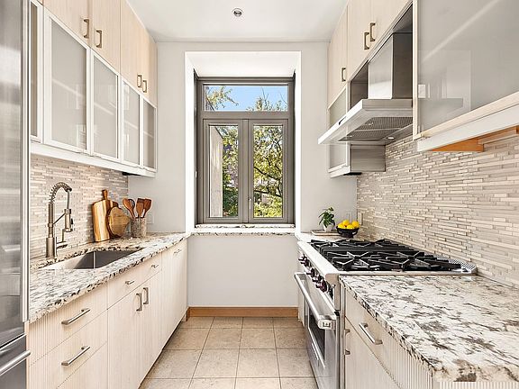 The south-facing, windowed chef’s kitchen is both functional and striking, featuring hand-selected Italian countertops, bespoke cabinetry, and premium stainless-steel appliances.