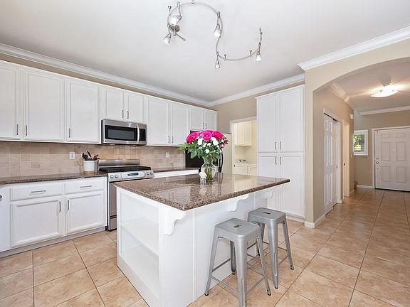 This spacious four-bedroom home is ideally tucked away on a private interior cul-de-sac within a gated community. From the moment you arrive, you'll be welcomed by curb appeal and an expansive driveway offering ample parking for family and guests. Inside, the open-concept kitchen flows seamlessly into the family room, creating the perfect space to prepare meals while staying connected. Modern finishes include crisp white cabinetry, granite countertops, and crown molding, adding both style and function to this bright, inviting space. Step outside to your very own backyard retreat featuring a sparkling built-in pool, gas-plumbed BBQ hookup, and a covered patio ideal for summer gatherings and year-round entertaining. Additional highlights include a built-in entertainment center, garage cabinetry, baby guard pool fencing, and a storage shed for added convenience. All of this is just minutes from top-rated schools, shopping, dining, parks, golf, and miles of scenic walking and biking trails. This home is ready and waiting for its next owner to enjoy everything it has to offer!