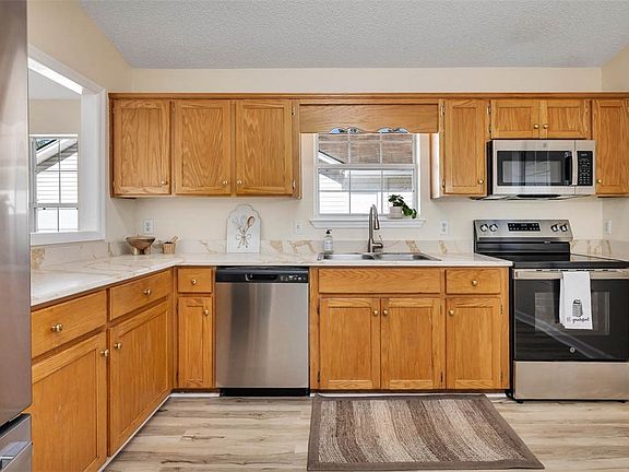 Cozy fireplacePartially fenced yardAttached two-car garageBeautifully updated kitchenBright open floor planNew stainless-steel appliancesLow-maintenance exterior