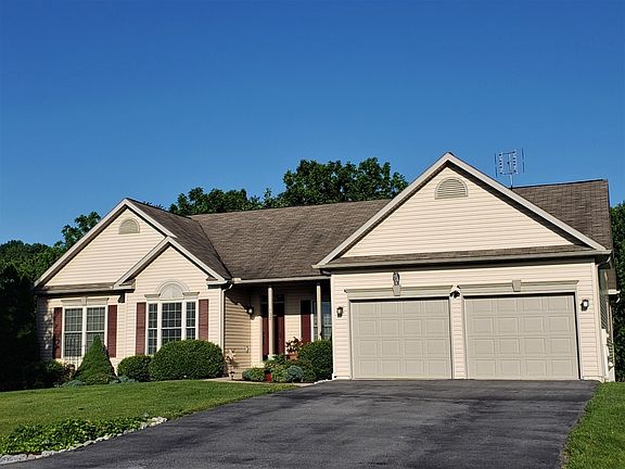 Beautiful & spacious 3 Bedroom 2.5 Bath Rancher in sought-after Spring Mills area in Falling Waters. Pride of ownership shows in this rancher with walk-out partially finished basement and oversize 2-car garage. The hilltop setting looks out onto mountain views to the east and spectacular sunrises. Walk-out basement has a finished family room/office/exercise room and unfinished storage area with 2 windows and plumbing for a full bathroom, giving lots of room for expansion. Main level has a huge master bedroom with sitting area, large walk-in closet and large full bath with shower, double-sink vanity, and jetted soaking tub. 2 more large bedrooms have a "Jack and Jill" bath. The half bath is adjacent to the large kitchen with eating area, huge living room, formal dining room with laminate wood flooring and bonus den with French doors. The kitchen has all GE upgraded appliances (2017), new laminate counter tops (2019) and new arc faucet (2018). French doors open onto the large deck overlooking the park-like backyard. The large laundry room has a new GE washer & dryer (2017). The home is full of natural light including 3 large windows looking out onto back yard. The 2/3 acre property is fully landscaped and features a secluded wooded area with a seating area and a fire pit. The natural area covers more than of the back perimeter of the yard. The patio, under the deck, has a large hot tub. Extras in the home are a custom front door, custom insulated garage doors (2011), completely new hvac system (2016) and new toilets (2019) in the master bathroom and 2nd bathroom. Annual hoa fee of $458 covers road maintenance, common grounds, a large swimming pool, tennis courts, playground and nature paths. Convenient to shopping, schools, dining and I-81. This home is a must see.