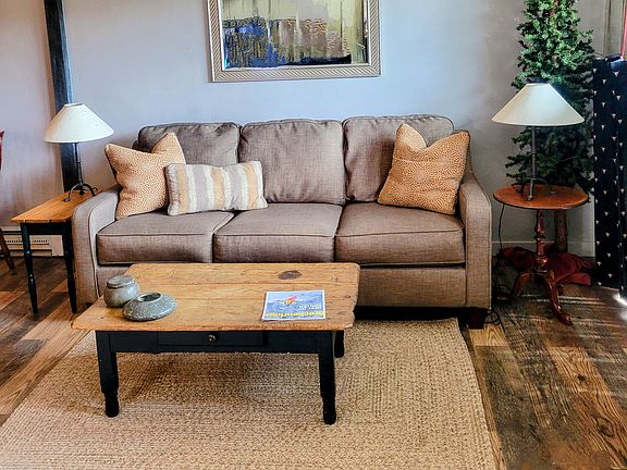 Entry level includes Livingroom, Dining area and designer kitchen with wood plank flooring and a cozy woodstove. Off the kitchen is a private bedroom with a queen, desk, tv, closet and full bath with tub/shower and a 2nd entry door.