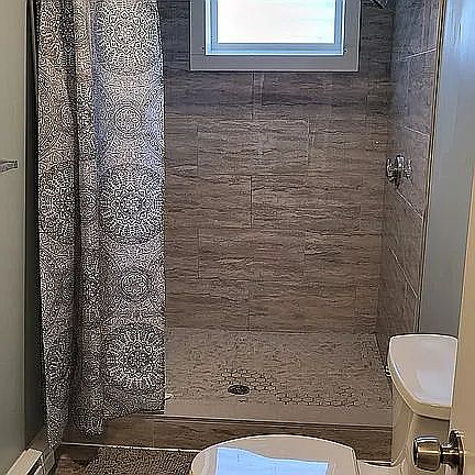 * Modern bathroom with tiled shower and rainfall shower head