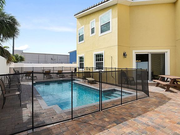 This spacious family townhouse, adorned with tasteful beach-themed decor, serves as an ideal home base in Indian Harbour Beach. Relax on the private patio with a pool or the upper balcony, and unwind in the wide living room with soft sofas and a mounted flat-screen cable Smart TV. The brand new fully equipped kitchen, featuring a long center island, stainless steel appliances, and quartz countertops, is a chef's dream. All five bedrooms are beautifully furnished, with two offering en-suite bathrooms with walk-in showers for added luxury.