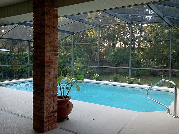 This beautiful block and brick stucco Lakefront Pool home was built in 2002 and is a home you will absolutely fall in love with. All the room sizes are large. The home features a large living room and giant size family room, a formal dining room and a breakfast room off the kitchen that has a breakfast bar and a pass thru to the screened pool and lanai. The laundry room is under air conditioning. The lot is approximately 1/2 acre sloping to a spring fed lake Lago Lindo with bass, bream, and lots of turtles. New laminate hickory floors in the family room, kitchen, & entry foyer, There is an adjoining lot also available for purchase. There are no Homeowners Associations or dues to pay. Along with a 2 car garage, there is a 12x30 workshop wired for electricity.