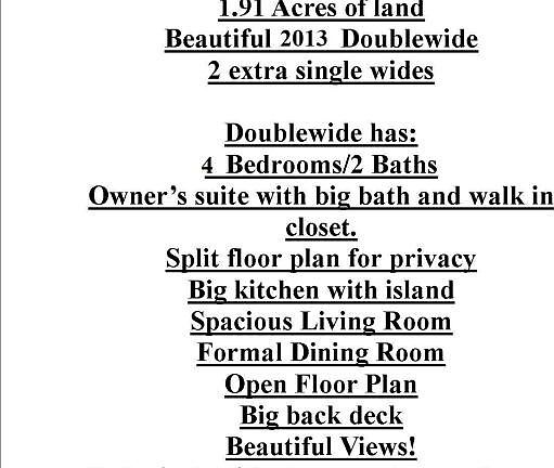 Great opportunity here! 1.91 Acres of land with a beautiful 20013 Doublewide home on perm foundation. This home features split floor plan, and an open concept. The owners suite has a huge bath and walk in closet. The living room, dining room and kitchen are all open to each other. The kitchen has beautiful cabinets and counters with center island. The living room is spacious and the dining room will hold your dining set just fine. Down the hall we have the hall bath, mud/laundry room and 3 more bedrooms. The 2 single wide are currently rented, with no leases in place. What a great opportunity for income!! The location is fantastic, being just 10 minutes to Oak Ridge. buyer to verify all information please.