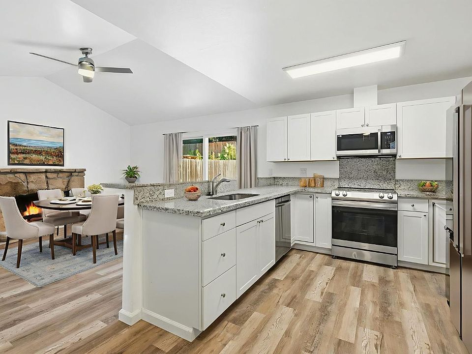 Beautifully updated 4 bedroom 2 bathroom single story ranch home. Gorgeous stainless steel kitchen with granite counter tops and a breakfast bar. Fabulous primary bedroom. Stunning bathrooms. Lot's of new upgrades including new flooring, appliances, furnace and air-conditioner, just to name a few. Freshly painted. Massive patio for outdoor fun and entertaining. Mature fruit trees. Oversized 2 car garage with lots of storage cabinets.