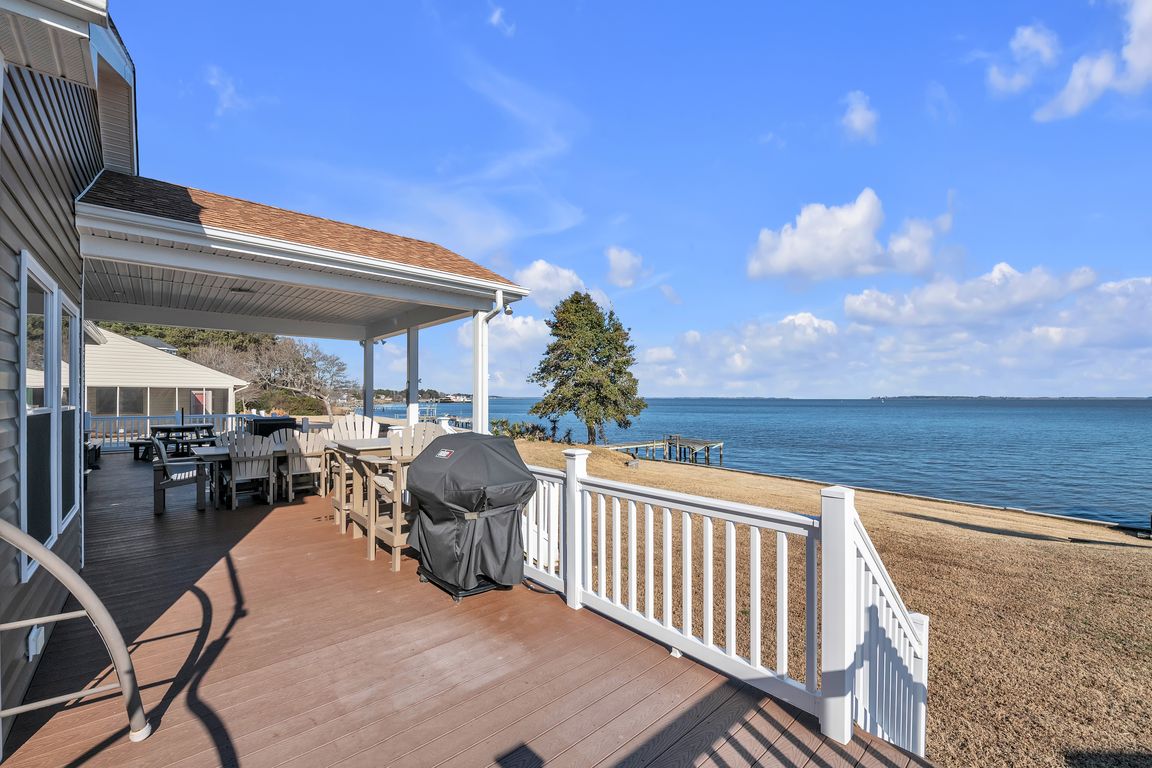 Nestled between the Outer Banks and Hampton Roads, this sought-after soundfront home in Currituck offers a private pier, bulkheaded shoreline, and breathtaking water views on a quiet private road. The home features a covered Trex rear deck with gas hookup for grilling, concrete crawl space, carport, and detached shed/workshop with 30-amp ...