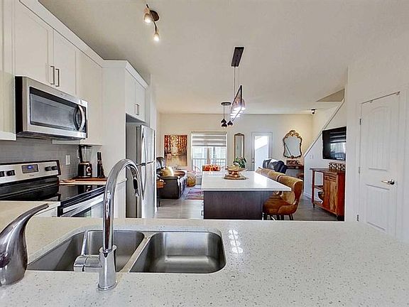 Welcome to 132 Legacy Point, a beautifully designed townhome built by Aldebaran Homes. Bright and airy, this corner unit residence offers a low-maintenance lifestyle ideal for comfortable modern living. The double attached garage with an additional double parking pad provides ample parking and storage. The entry level features a spacious flex room that can serve as a bedroom or home office, a welcoming foyer, and a functional built-in bench with storage. The main level offers an open-concept layout with 9' ceilings, laminate flooring, and upgraded lighting fixtures throughout. The kitchen includes quartz countertops, stainless steel appliances, and a large island that’s perfect for cooking and entertaining. Two balconies—one at each end of the home, including one with a propane barbecue connection—bring in abundant natural light and fresh air. Upstairs, the primary suite includes a walk-in closet and private ensuite. Two additional bedrooms and a four-piece bath complete this level. The home is located steps from Legacy’s environmental reserve and scenic pathways, within the estate area, and offers convenient access to schools, shopping, and amenities. The complex is attractively landscaped and well maintained. Willing to sell home furnished.