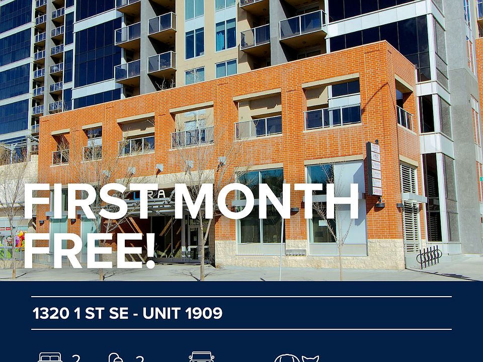 Modern 2 Beds, 2 Baths Apartment/Condo | No Pets Allowed | Monthly Rent for 12 Month Term Includes Welcome Offer Welcome to your new home at 1320 1 St SE - Unit 1909 - Unit 1909 a modern and well-maintained 2 beds / 2 baths / Apartment/Condo offering comfort, space, and convenience. Ideally located close to shopping, schools, parks, and transit. SHOWINGS: Conducted in an open-house format book your appointment today! Prices, availability, and promotions are subject to change without notice. PROPERTY DETAILS: - Furnished or Unfurnished: Unfurnished - Pets: No Pets Allowed - Smoking: Non- Smoking - Parking: Underground - Storage Included: Yes - Laundry: In- Suite Laundry - AGE RESTRICTED: OCCUPANTS MUST BE 18+ - Management Type: Full Management - Lease Term: Long Term UNIT FEATURES: - Living Space:Open-concept living room layout, perfect for relaxing or entertaining - Kitchen: Sleek and modern kitchen with all appliances for a contemporary look with plenty cabinet storage to keep everything organized - Dining Space: Open-concept design flowing into the living space, perfect for entertaining - Bedrooms: 2 Bedrooms featuring ample storage for clothing and accessories - Window Coverings: Includes window coverings for privacy and light control UTILITIES: - Utilities Included: Heat,Water Here''s a helpful tool you can use to get a rough estimate of utility costs. LOCATION HIGHLIGHTS: - Outdoor Living: Nearby Parks, Pathways, Greenspaces - Transit & Access: Transit Lines / Major Roads Nearby - Family Friendly: Close to Schools, Childcare, Rec Centres - Local Conveniences: Groceries, Shops, Restaurants, Services Nearby Don''t wait properties like this don''t last long. Welcome Offer: The listed rent already includes a special savings equal to one month''s rent, spread evenly across your 12-month lease. Available on new 12-month leases only.