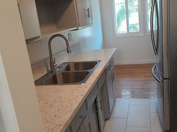 Completely renovated apartment. Lovely, vintage courtyard style building. Unit has one parking space. Hardwood floors, stainless range, microwave, french door style refrigerator, and lots of storage in newly painted kitchen cabinets with stone counters and back splashes and ceramic tile floors. All new tub and tile in bath, newer stone floors, and medicine cabinet. Nice size bedroom with lots of closet space. Walking distance to Santa Monica retail stores and restaurants. Nine blocks from the beach!
