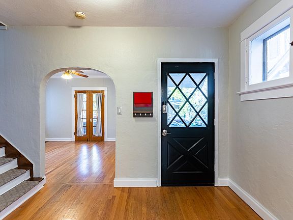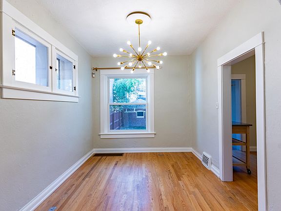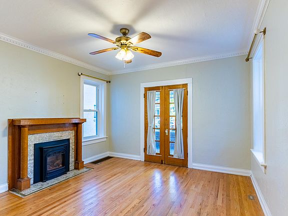 The home includes a gas fireplace, hardwood flooring, new mini-split air conditioning, whole-home humidifier, french doors that lead to an enclosed front porch, high ceilings, and private yard. 1536 sq ft finished on main floor and second story; 507 sq ft unfinished basement perfect for storage. Floor plan is included in pictures. Second story contains full bath and three bedrooms: larger master bedroom #1; bedroom #2 has a built-in shelving and murphy bed with attached sun room, perfect as guest room or office; bedroom #3 can be used as bedroom or office. Main floor includes foyer, living room, kitchen, formal dining room, half bath, and front porch. Unfinished basement includes lots of storage and washer/dryer. Two parking spots included, one-car garage plus one additional uncovered parking spot. Local district schools are Teller elementary, Morey Middle School, and East High School.