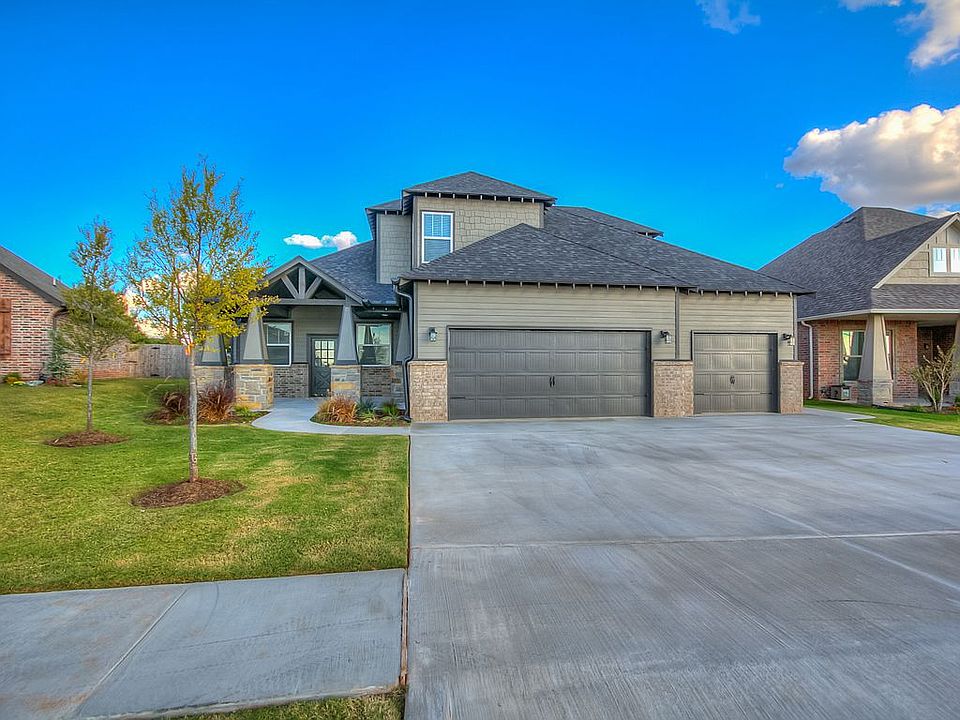 Gorgeous Craftsman style home in Sonoma Lakes. This exquisite 3 bedroom, 2.5 bath home boasts an incredible open floor plan with living and kitchen centered around a 15 ft quartz island. Beautiful hardwood floors, fireplace with quartz mantel, and in-ceiling speaker system in addition to stunning quartz counter tops and walk in pantry. Plus a study with built-in desk. The ensuite bedroom features double vanities, walk-in shower, soaking tub, and walk-in closet with built-in drawers which opens to laundry room. Secondary bedrooms and main bath are upstairs. Tankless hot water, zoned AC, storm shelter in garage, multi-zone sprinkler system, and exterior speakers in front and back. Shed in back to stay.