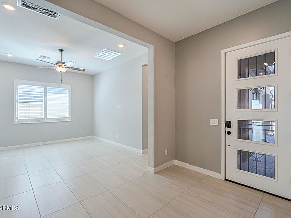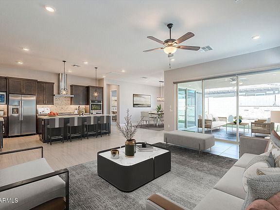 Located in a gated community in Chandler Arizona, this home features a gourmet kitchen including stainless steel appliances with a 36'' gas cooktop, a refrigerator, double ovens, built-in microwave, walk-in pantry, Sonoma Maple slate cabinets, designer selected kitchen backsplash, and quartz countertops. The heavy traffic areas of the home have 18'' x 36'' tile flooring with carpet only in the 2nd, 3rd, and 4th bedrooms. The spacious great room opens to the kitchen and extended dining room and boasts 12' multi-slider doors that open to the extended covered patio. The 16 x 16 primary suite offers a frameless walk-in shower, a rain can shower head, and 2 sinks. Quartz countertops can also be found t/o the home. Washer and dryer included, Garage floors epoxy, window coverings