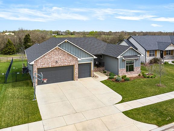 This move in ready 5 Bedroom 3 bath 3 car garage resides on a a quiet cul de sac in the Arbor Creek Addition. You will have sidewalk access to Amelia Earhart Elementary and the entire Goddard High school/Middle school campus. This one of a kind custom built flex plan also backs up to a wooded tree line for extra privacy. This 3 year old home boasts many upgrades and well thought out design. It has luxury black metal windows, a wet bar in the basement, covered elevated concrete patio, walk in pantry, walk in closets, vaulted ceiling with beams, an oversized kitchen island, quartz and granite countertops, coat rack and cubbies, and a pass through laundry room accessible from master bedroom closet. The kitchen and dining room gives you plenty of eating and dining options. You can sit at the oversized island or expand into the oversized dining area with vaulted ceiling with beautiful wooden beams. The dining area can comfortably hold a 8 -10 foot table for those holiday gatherings. This flex plan also allows the family to spread out as it flows easily between the 3 different living areas. The exterior includes a black aluminum fenced in yard with irrigation well and sprinkler system. Relax on the front porch swing and watch the kids play on the glass basketball goal. You can also relax in serenity on the elevated covered concrete patio as the lot backs up to a green space and tree line for added privacy. You are just steps away from neighborhood pool, pickleball courts, playground, clubhouse and fitness room. Come fall in love with this home before it's gone.